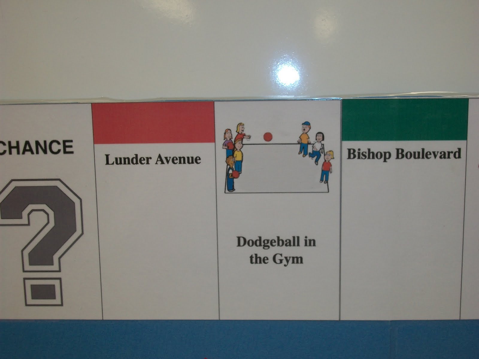 I used teacher names for the streets which I thought the kids would get a kick out of--I also didn't want to do brain builders so I made those into places around our school...and since I like to play dodgeball with my kids during PE, I added that one!